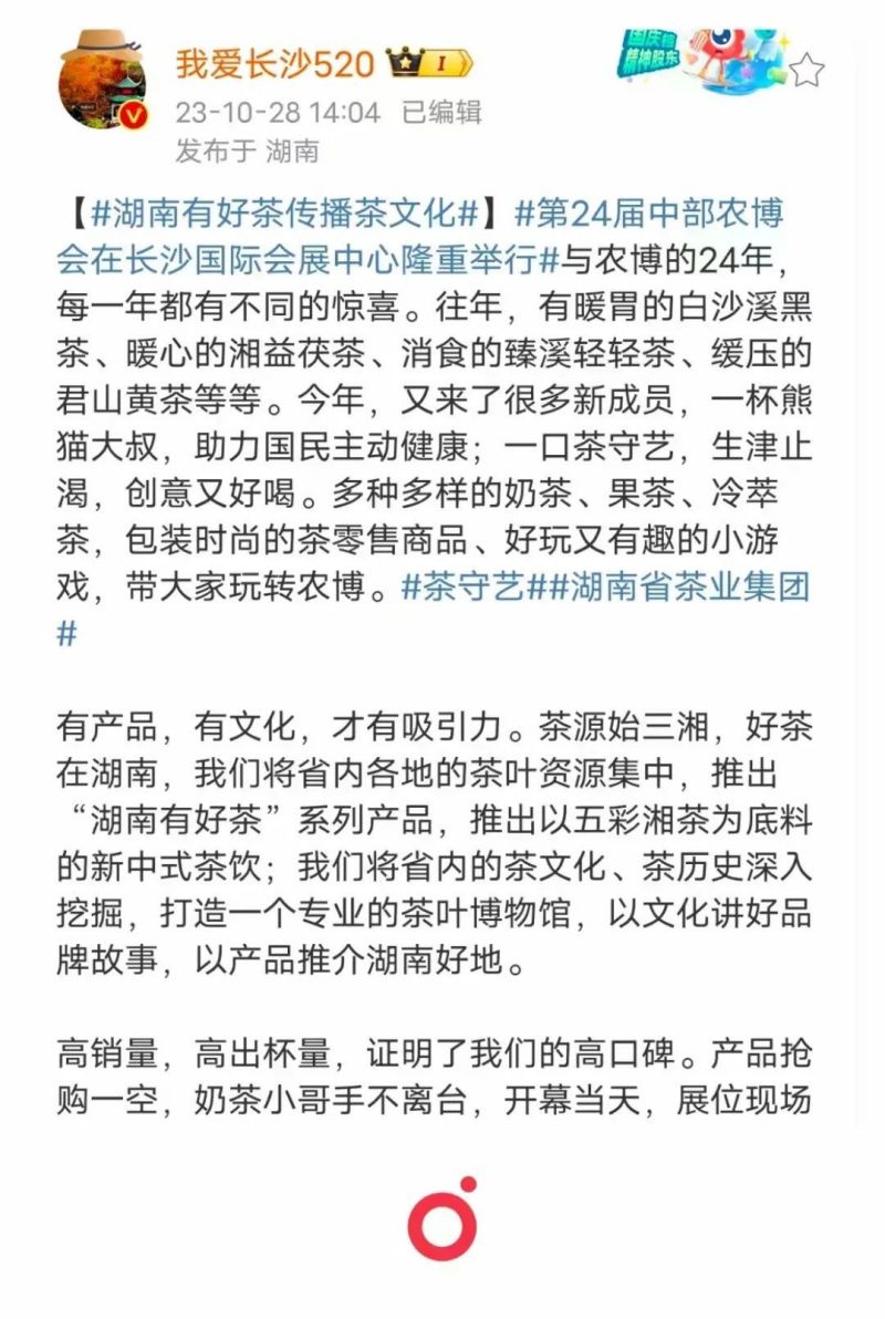 此次農(nóng)博會,集團(tuán)一是繼續(xù)借助人民網(wǎng)、湖南日報、紅網(wǎng)、長沙晚報、湖南衛(wèi)視、湖南都市、長沙電視臺等傳統(tǒng)媒體,以高質(zhì)量高吸睛度的圖文報道和當(dāng)下流行的短視頻報道增強(qiáng)品牌、產(chǎn)品、渠道宣傳力度。二是繼續(xù)利用自身官方網(wǎng)站、微信公眾號、視頻號、小紅書等新媒體同步轉(zhuǎn)發(fā)媒體報道和原創(chuàng)相關(guān)內(nèi)容,借助媒體高影響力和高關(guān)注度提高公司自有媒體平臺的粉絲和流量。三是加強(qiáng)與 我愛長沙、 嘉俊日記簿、 三湘頭條等網(wǎng)絡(luò)大咖的聯(lián)動,通過微博、百度、今日頭條同步宣傳推介集團(tuán)品牌產(chǎn)品,集團(tuán)參加此次農(nóng)博會情況登上長沙同城熱搜,“湖南有好茶傳播茶文化”話題討論熱度持續(xù)上漲。四是借力來展位打卡的網(wǎng)紅和名人如湖南衛(wèi)視著名新聞主播魏哲浩、湖南衛(wèi)視知名主持人杜海濤等,進(jìn)一步吸引消費者、擴(kuò)大茶產(chǎn)品銷售、提升品牌影響力,實現(xiàn)了人氣、銷量、口碑三豐收。