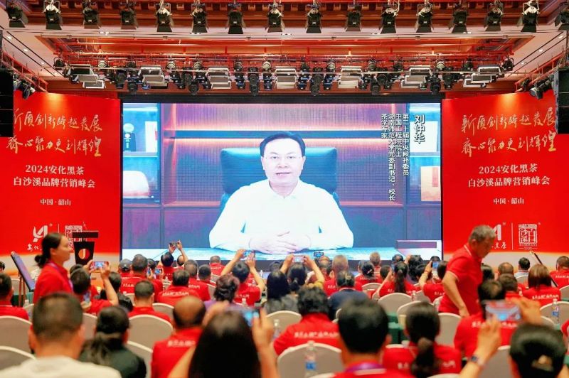 白沙溪副董事長劉新安,安化縣委常委、宣傳部部長廖小甫,益陽市茶業(yè)協(xié)會黨支部副書記匡維波,湖南省茶業(yè)協(xié)會會長、集團公司董事長、白沙溪董事長周重旺先后致辭。第二十屆中央候補委員、中國工程院院士、湖南師范大學黨委副書記、校長劉仲華特別為峰會作視頻講話。白沙溪總經(jīng)理孟濤作《安化黑茶白沙溪品牌2023-2024工作報告》。