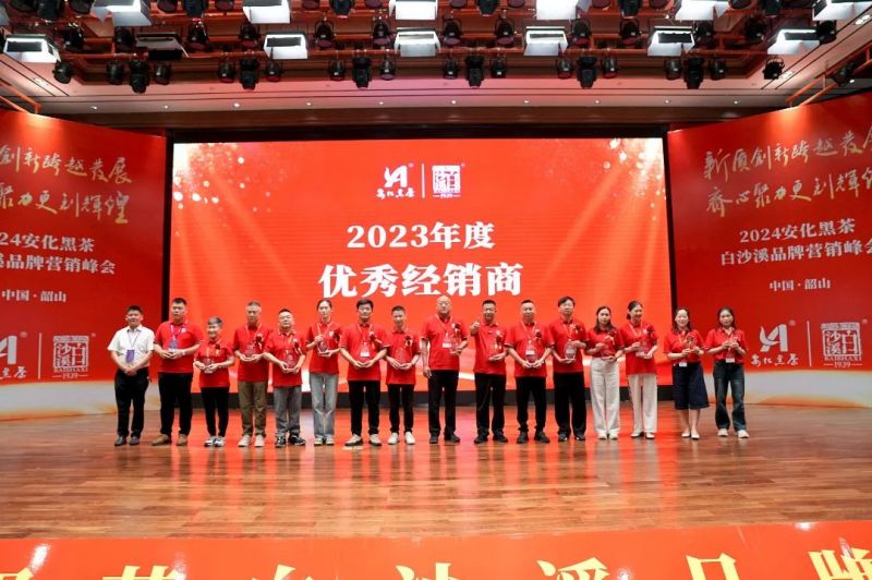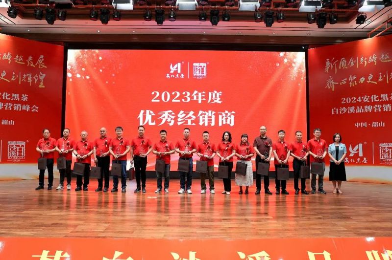白沙溪副總經(jīng)理劉輝宣讀《白沙溪2023年度優(yōu)秀經(jīng)銷商表彰決定》,湖南將軍茯茶業(yè)有限公司、廣州市永利昌茶葉有限公司榮獲“2023年度戰(zhàn)略合作伙伴獎”;湖南省新茗星茶業(yè)有限公司、廣州演通貿(mào)易有限公司、青海省茶業(yè)有限公司榮獲“2023年度卓越營銷獎”;湖南伍愛創(chuàng)意文化科技有限公司、杭州白沙溪電子商務有限公司、湖南天胤貿(mào)易有限公司榮獲“2023年拓展創(chuàng)新獎”;湖南省嫩香靈茶業(yè)有限公司等30家單位榮獲“2023年度優(yōu)秀經(jīng)銷商”稱號。