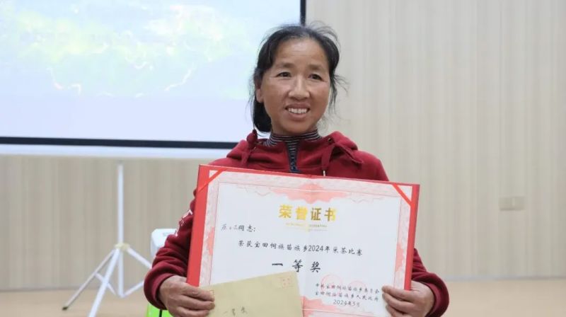 “我以前到這里采過茶,有經(jīng)驗,所以參加今天的采茶活動摘得又快又好,獲得了一等獎,特別開心,希望以后多搞幾次活動,我們繼續(xù)努力?!边B道苗寨村村民蔡玉花說。