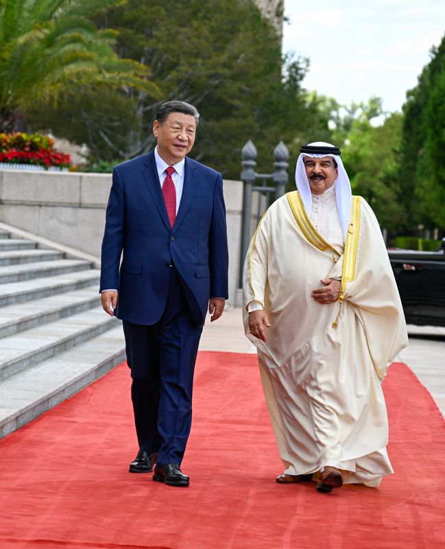 5月31日下午,國家主席習(xí)近平在北京人民大會堂同來華國事訪問并出席中阿合作論壇第十屆部長級會議開幕式的巴林國王哈馬德舉行會談。這是會談前,習(xí)近平在人民大會堂東門外廣場為哈馬德舉行歡迎儀式。新華社記者 張領(lǐng) 攝